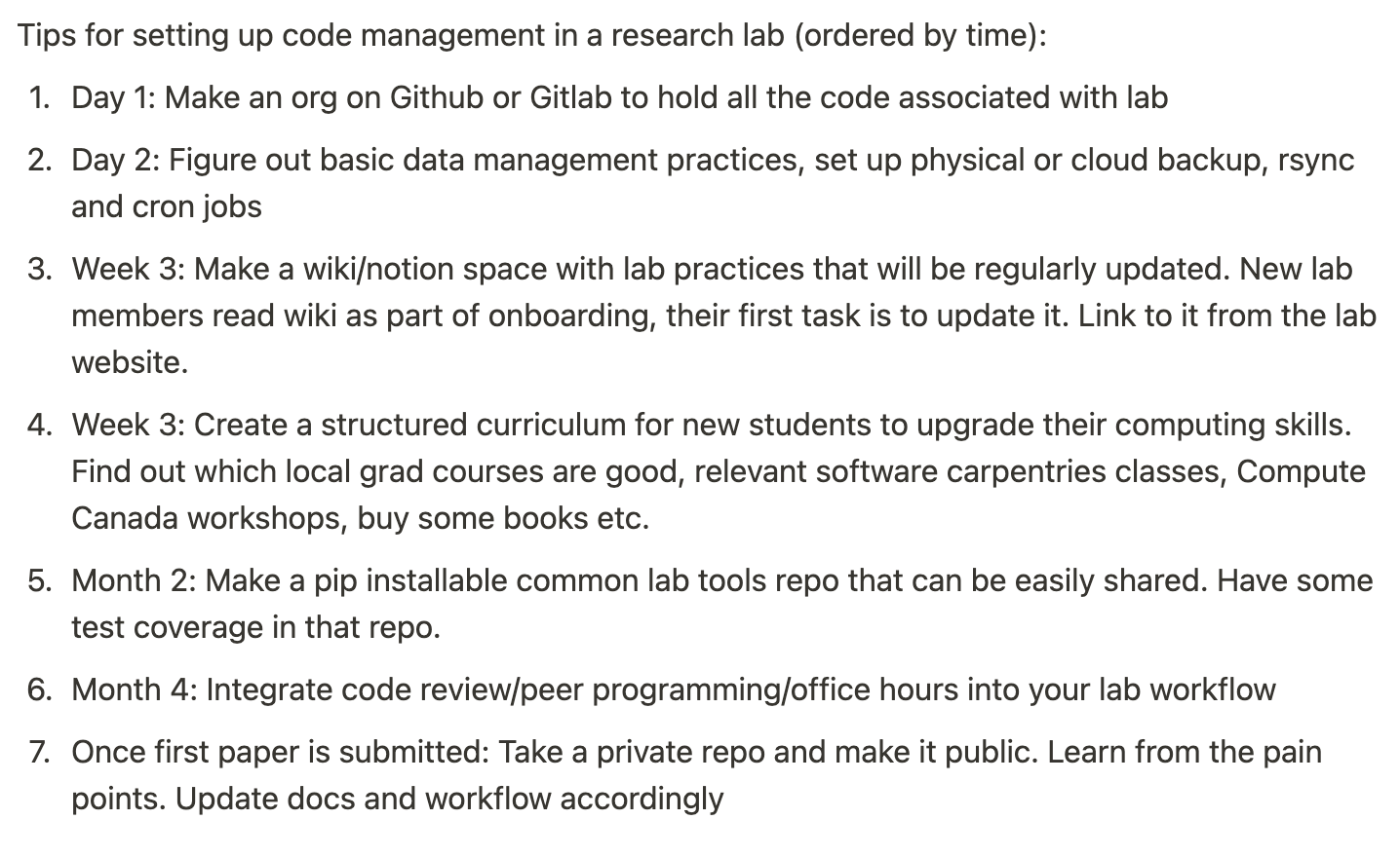 Note that out of these topics raised by my research team, they correspond to items 3+4+5 in this nice list of "Tips for setting up code management in a research lab" -- I can't find the original link but I think it maybe came from Patrick Mineault.