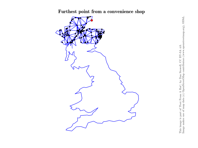 The point that achieves the furthest distance from a convenience shop is here, with the nearest to it being this.